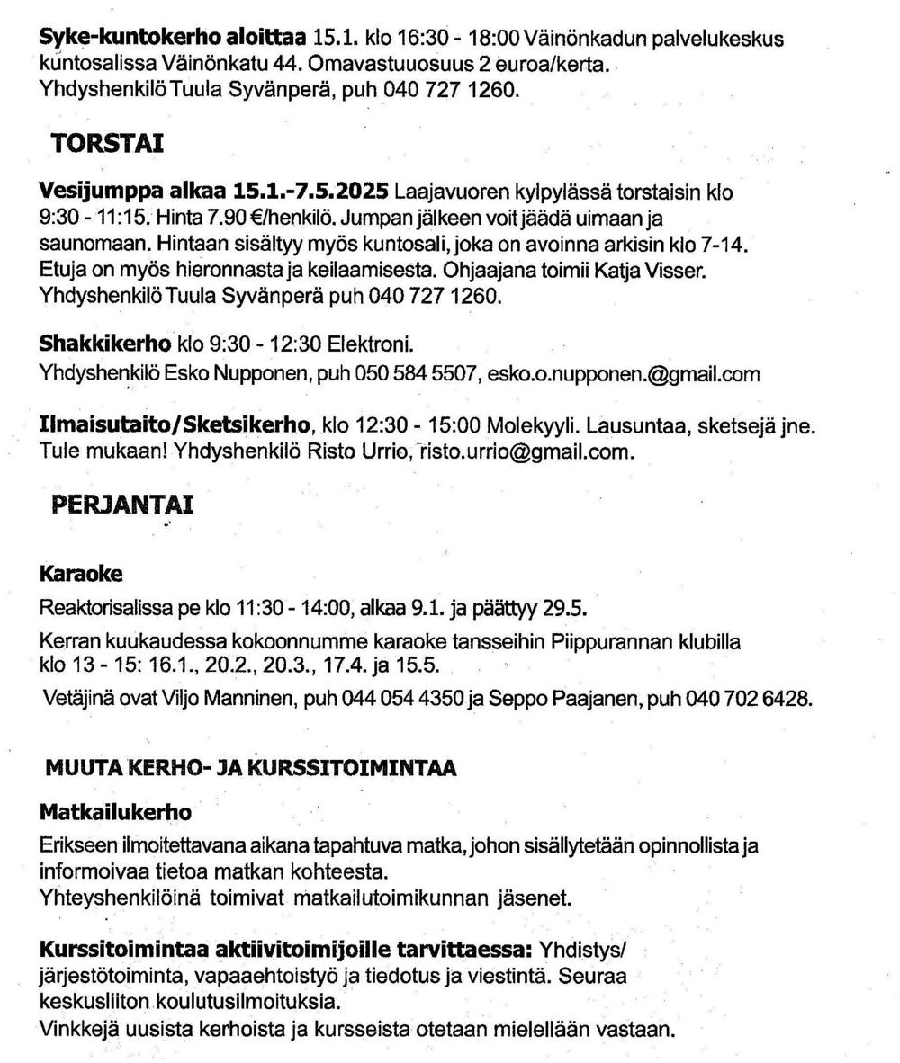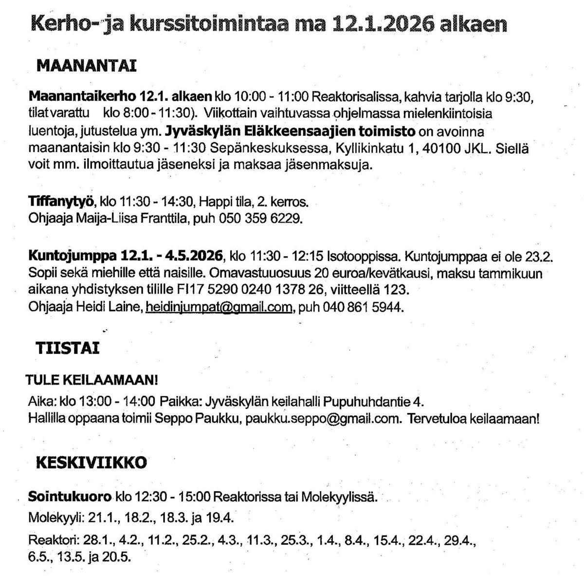 Kurssien ja kerhojen viikko-ohjelma kevätkausi 2026